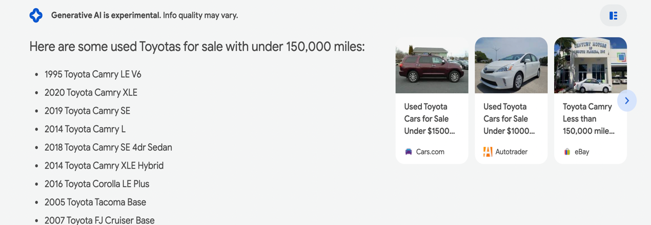 For instance, say you decide to buy a car, and you type “good car with under 150,000 miles for sale”.